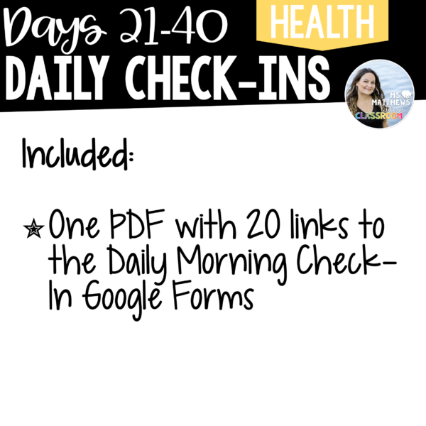 With the Daily Morning Check-In Google Forms for Days 21-40, you can further deepen your connection with your students. Gain valuable insights into their evolving thoughts and emotions while nurturing a strong sense of community, whether in traditional or remote learning environments.