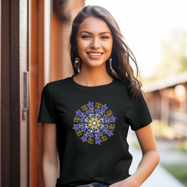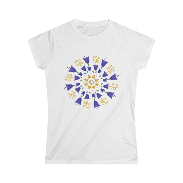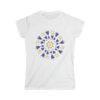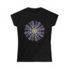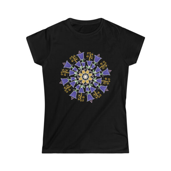 The woman's softstyle tee is a more feminine take on the classic tee. The sleeves are shortened to reveal some shoulder. The fabric is a blend of cotton and polyester. There are no side seams because the garment is knit in one piece. The shoulders are taped with twill to prolong durability. The collar seam is reinforced with ribbed knitting.